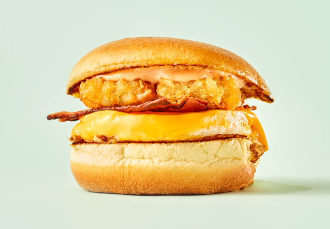 「Wake Up Shack」は、ベーコンと卵に加え、カリッと揚げたポテト“トッツ”まで挟んだ満足感たっぷりのバーガー。クリーミーな自家製ブレックファストソースが決め手。